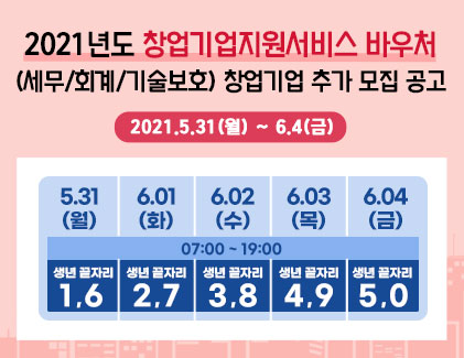 5,400개사 대상으로 최대 100만원까지 지원하는 창업기업지원서비스 바우처 추가 모집이오니 만 39세 이하 청년 창업자, or 3년 이내 초기창업자 분들이라면 신청기간 놓치지 마시고 K-STARTUP 스타트업 창업기업지원서비스 바우처 추가 모집 신청해서 꼭 지원 받으시길 바랍니다.