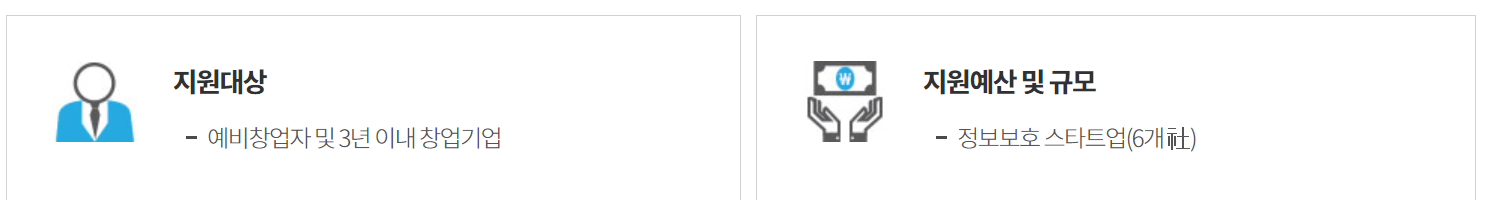 지원대상은 예비창업자 및 3년 이내 창업기업이며 지원 규모는 정보보호 스타트업 (6개)입니다.