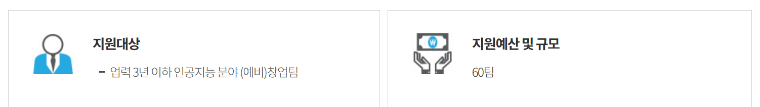 지원대상은 업력 3년 이하 인공지능 분야 (예비)창업팀이며 지원 규모는 60팀 입니다.